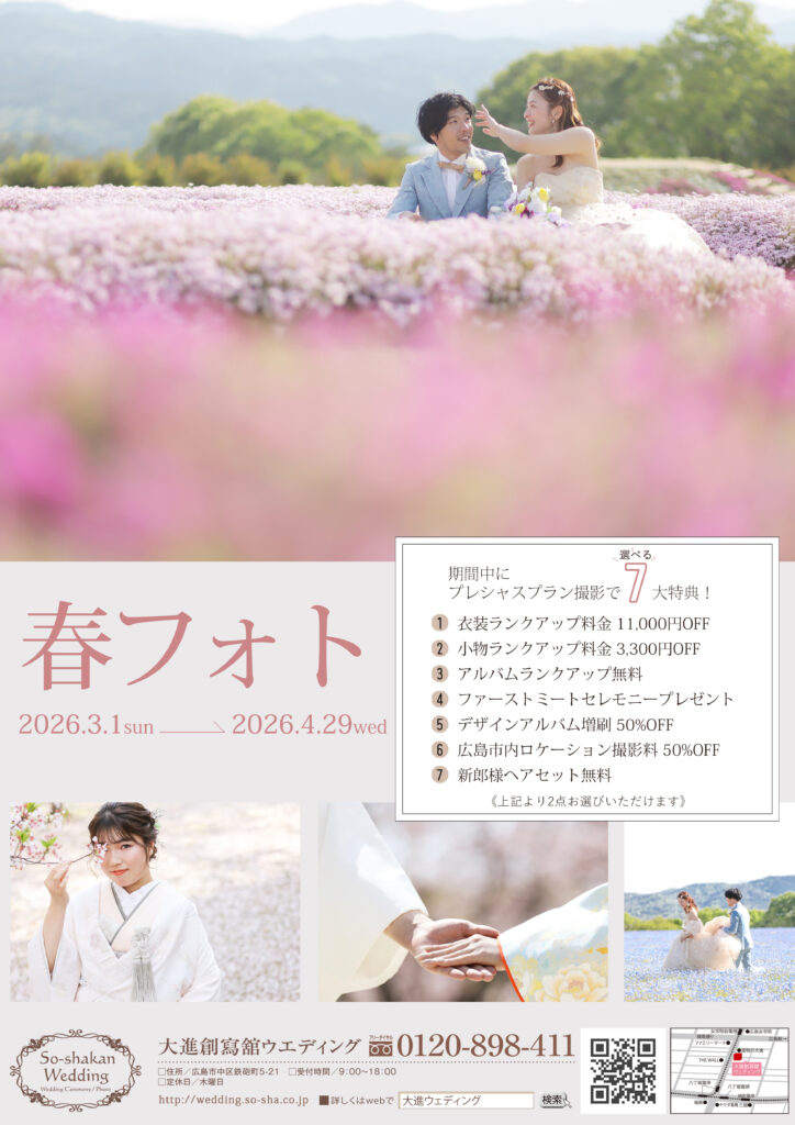 「春フォトキャンペーン」と題しまして3/1(日)~4/29(水)の期間中、プレシャスプランのご利用で選べる7大特典プレゼント♡