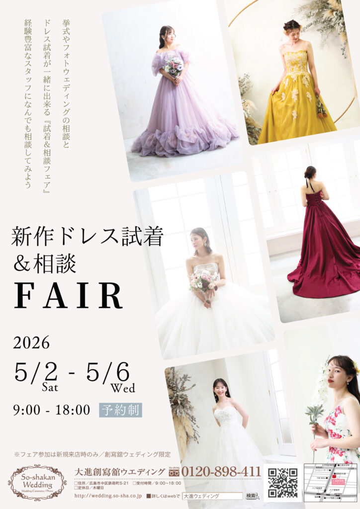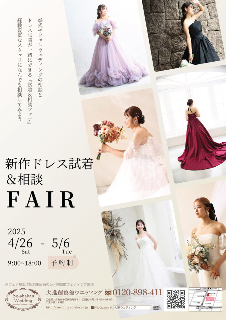 ブライダルフェア ゴールデンウィーク◆新作ドレス試着&相談フェア◆ ゴールデンウィークの予定が決まっていないプレ花嫁様にフェアのご案内です! 5/2(土)~5/6(水)の期間、創寫館ウェディング限定で『新作ドレス試着&相談フェア』を開催いたします。 お好きなドレスの試着と挙式やフォトウェディングについてなんでも相談できる相談会にご参加いただけます! フェア参加はご予約制となっております。 フェア予約とご記入の上、ご予約をお願い致します。 ご予約は【こちら】